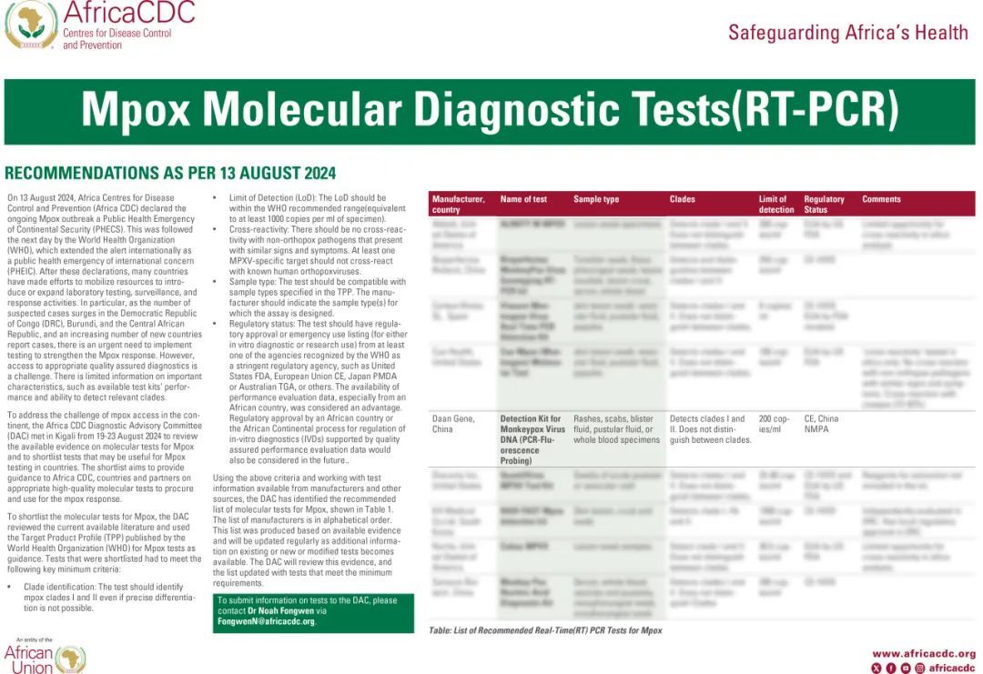 8月28日,非洲疾病預(yù)防控制中心(Africa CDC)公布了首批推薦的猴痘分子檢測(cè)產(chǎn)品名單,達(dá)安基因猴痘病毒核酸檢測(cè)試劑成功入選。此外,在8月18日,該試劑獲得國(guó)家藥監(jiān)局批準(zhǔn)上市,成為國(guó)內(nèi)首個(gè)獲批上市的猴痘病毒檢測(cè)產(chǎn)品。