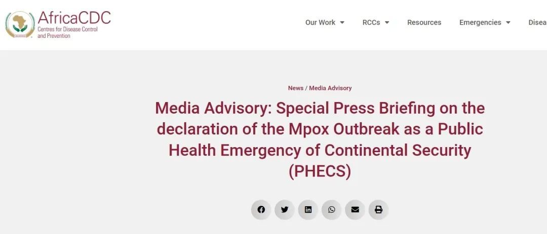 [1]Africa CDC.Media Advisory: Special Press Briefing on the declaration of the Mpox Outbreak as a Public Health Emergency of Continental Security (PHECS) August 12, 2024,fromthe World Wide Web:https://africacdc.org/news-item/media-advisory-special-press-briefing-on-the-continental-declaration-of-mpox-outbreak/